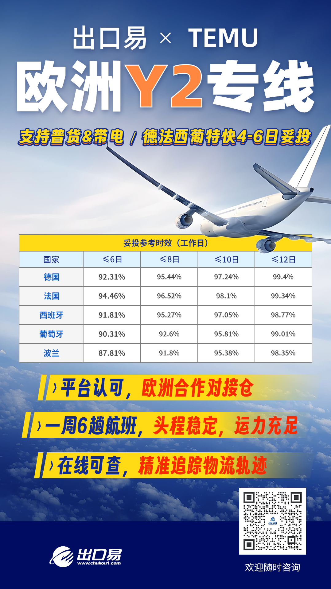 出口易已推出欧洲Y2直发方案,覆盖德国、法国、西班牙、葡萄牙、波兰等国,时效稳定,超级专线4-6日高效妥投!