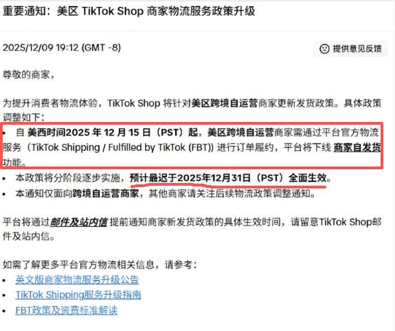 TikTok Shop官方给美国跨境卖家们划下了一道明确的时间线:从2025年12月15日起,所有跨境自运营商家将无法再使用自发货方式完成订单。