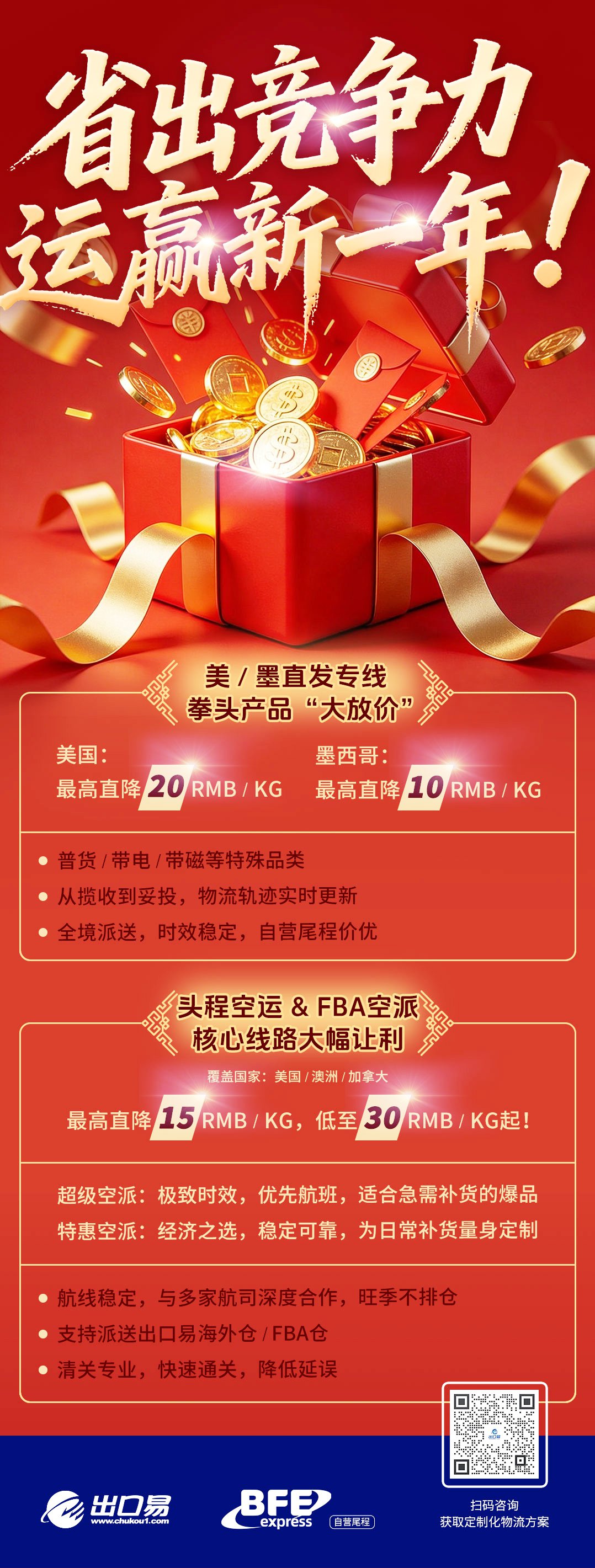 “省”出竞争力,“运”赢新一年!出口易2026开春双重特惠来啦 (一)美/墨直发专线,拳头产品“大放价” 美国:最高直降 20RMB/KG 墨西哥:最高直降 10RMB/KG (二)头程空运&FBA空派,核心线路大幅让利 最高直降15元/KG,低至30元/KG起! 覆盖国家:美国 \澳洲\加拿大
