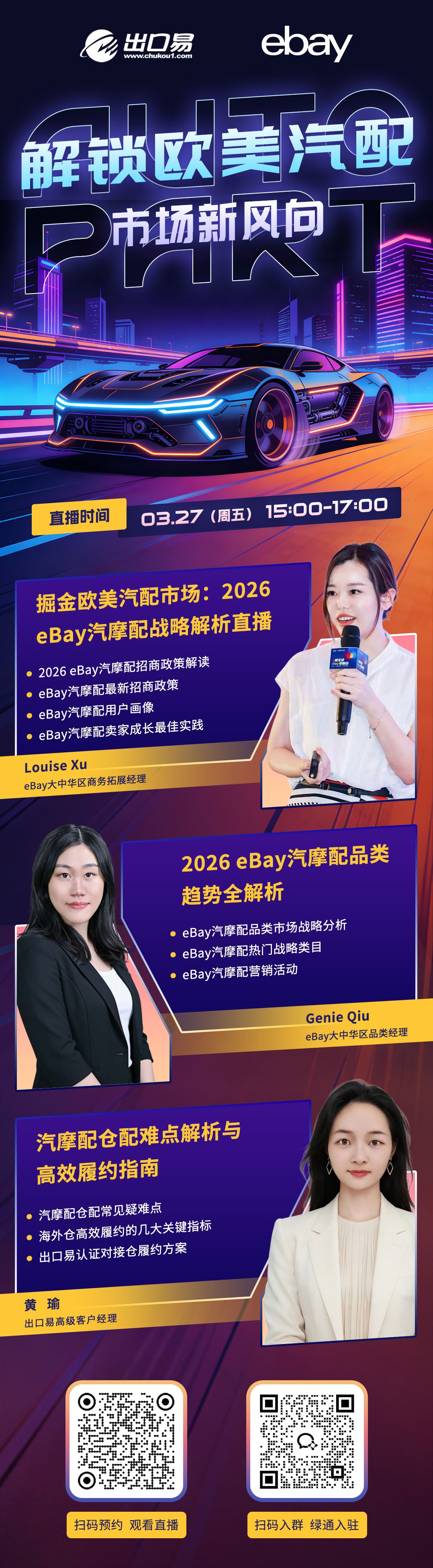 解锁欧美汽配千亿增量!出口易 × eBay官方直播,来了! 想抓住欧美汽配市场的新风口?这场直播别错过👇 ⏰ 时间:3月27日(周五)15:00-17:00 🎯 直播亮点抢先看: ✅ eBay 汽摩配招商政策全解读 ✅ 2026 欧美汽配市场用户画像、爆款类目全解析 ✅ 仓配难点破解 + eBay认证仓高效履约方案 ✅ 卖家成长最佳实践全分享 市场机会不等人,下方海报扫码预约,抢占先机!