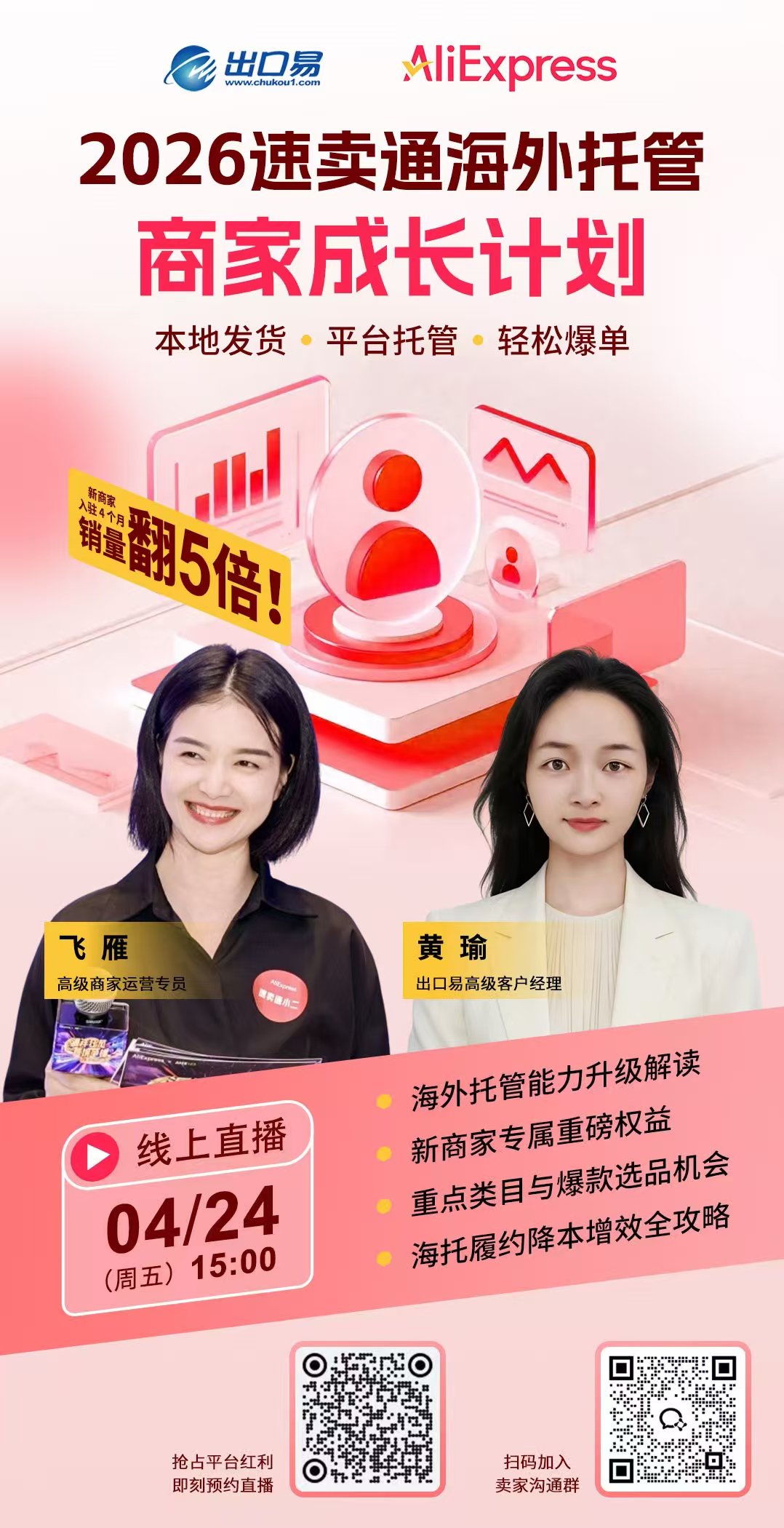 紧跟平台风向,速卖通2026海外托管商家成长计划,04/24(周五)15:00直播见! 👉想做海外托管但不知如何起步?2026借平台红利抢占新赛道,GET新商家专属重磅权益! ✅ 重点类目与爆款选品机会——官方数据带你挑品 ✅ 海外托管履约降本增效攻略——物流优化方案 🔥 立即行动:扫描海报二维码,一键预约/加入卖家交流群获取直播&入驻通道!