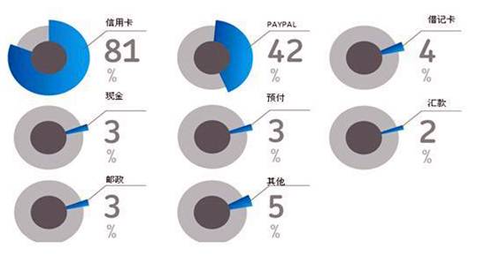 在支付方面,消费者习惯并熟悉于各种先进的电子支付方式,如网上支付、电话支付、邮件支付等。信用卡的渗透率非常高,81%的在线支付都是信用卡支付,紧随其后的是使用PayPal,如下图所示: